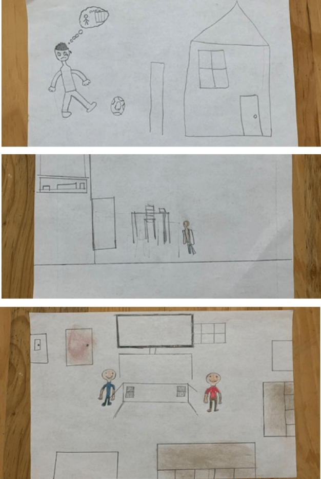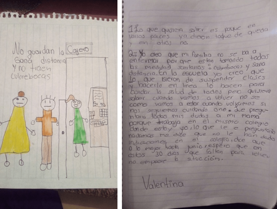 Los niños observan la incertidumbre y la retratan. Observan que los adultos en el cajero no portan cubrebocas ni guardan la sana distancia que mencionan por todos lados; también se cuestionan si habrá medidas para volver a la escuela y si todos se seguirán cuidando, a la vez que esperan que no empeore la situación.